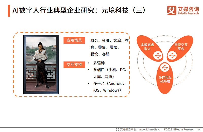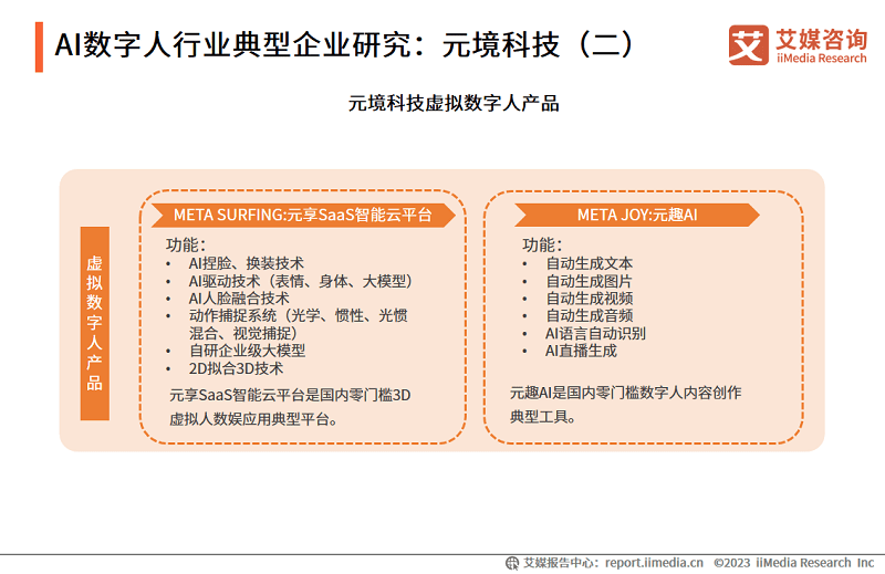 2023年4月,元境科技在“MetaSurfing-元享智能云平台”产品发布会上提出了AIGC+X的产品体系模式,产品在元享平台的基础上以AIGC技术为核心,降低虚拟数字人创作门槛,提高数字人创作效率。元享SaaS云平台与元趣AI作为元境科技的主要数字人产品,突破了现有传统虚拟数字人生产制作流程,实现了超高精度渲染技术及生成效果,为客户提供低成本数字助手。