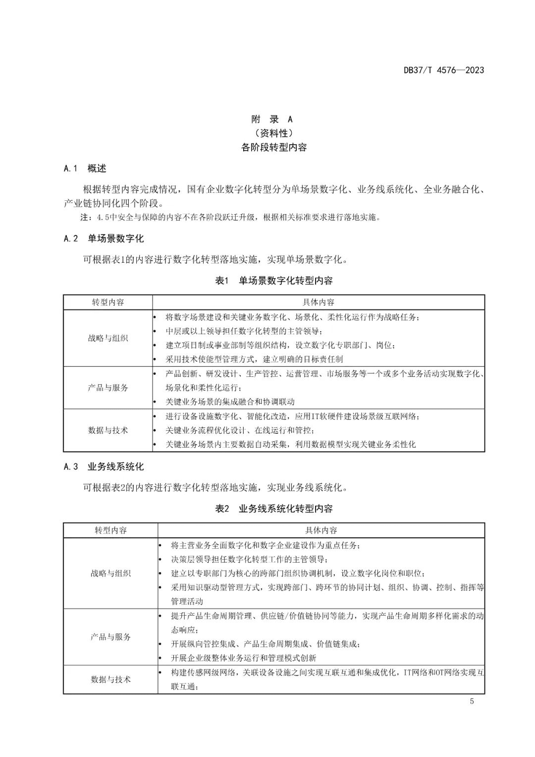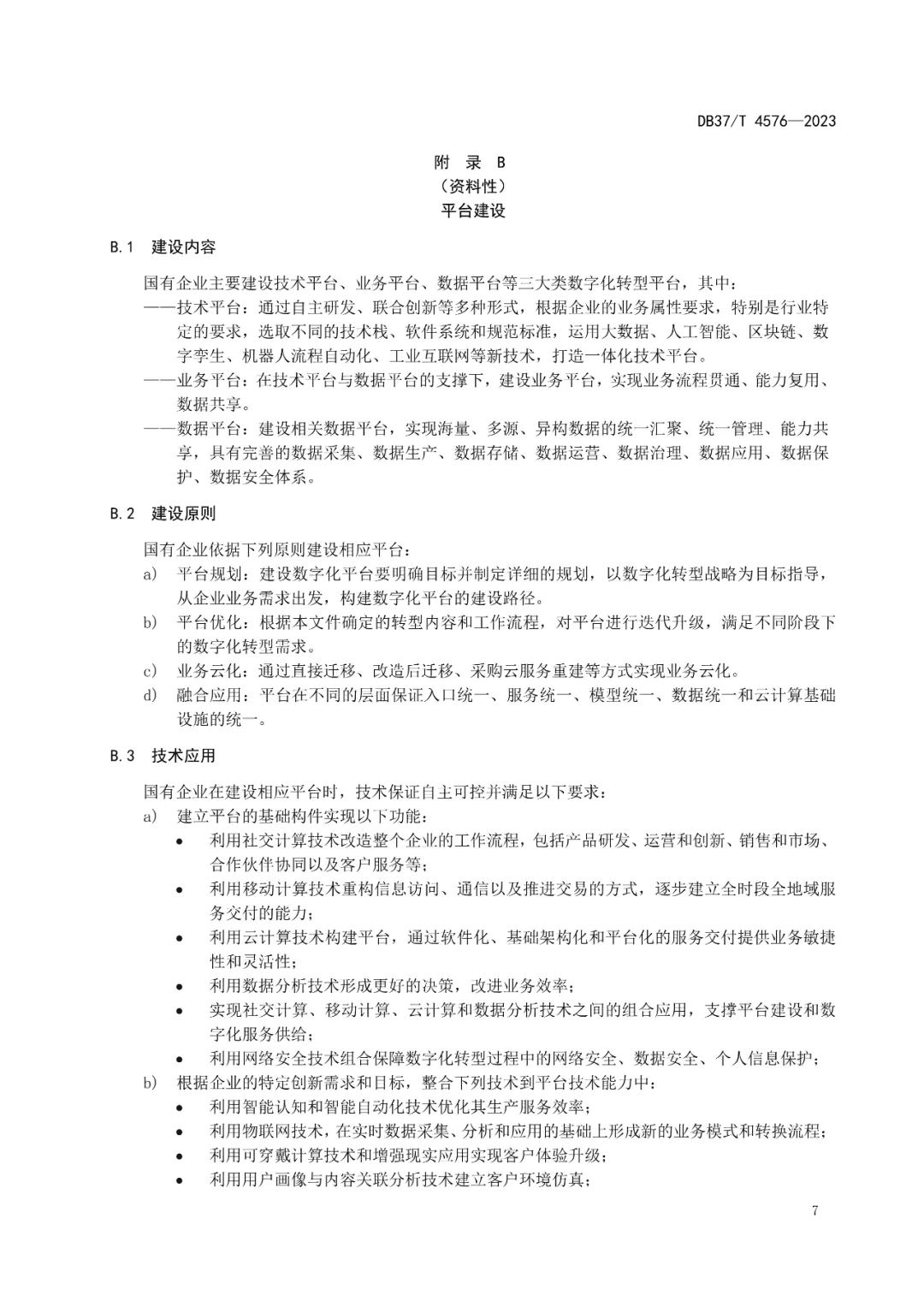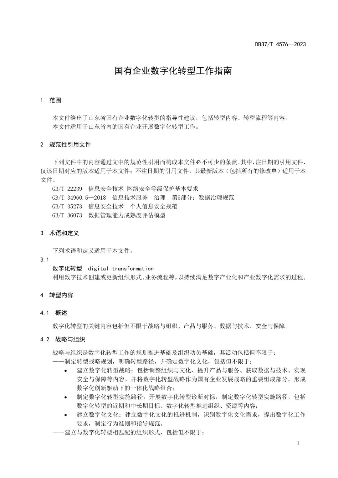 日前,山东省地方标准《国有企业数字化转型工作指南》(DB37/T 4576-2023)正式发布,这是全国第一个数字化转型地方标准。编制期间,山东省国资委联合山东山科数字经济研究院有限公司、浪潮集团有限公司和山东可信云信息技术研究院等单位,成立标准编制工作组,整体推进标准的调研、起草等工作。标准编制工作组认真研究国务院国资委、山东省委、省政府相关政策文件,全面查阅相关文献、白皮书、“十四五”规划等相关材料,对当前国有企业数字化转型情况进行了系统性梳理、归纳,从转型内容、转型流程等方面给出了山东省国有企业数字化转型的指导性建议,为山东省国有企业开展数字化转型工作提供技术指导和参考依据。《国有企业数字化转型工作指南》转型内容一章给出了国有企业数字化转型的主要工作内容。基于国有企业数字化转型现状及需求,数字化转型的关键内容包括战略与组织、产品与服务、数据与技术、安全与保障。转型流程一章给出了国有企业数字化转型的工作流程内容。主要包括转型规划、落地实施、检查反馈和改进提升等四个步骤,并明确了相关要求。各阶段转型内容一章以资料性附录的形式给出了国有企业转型各阶段的转型建议。根据转型内容,国有企业数字化转型分为单场景数字化、业务线系统化、全业务融合化、产业链协同化四个阶段,本标准给出了各转型阶段数字化转型的关键点。平台建设一章以资料性附录的形式给出了国有企业在落地实施的过程中平台建设的相关建议,明确平台的建设内容、建设原则及技术应用。