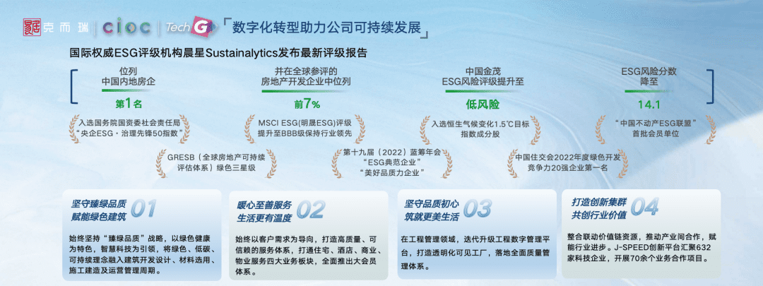 In terms of customer service, it has always been customer-oriented, creating a high-quality and reliable service system, opening up the four business segments of residential, hotel, commercial and property services, and fully launching a large member system. In terms of innovation and development, the integration of linkage value chain resources. The promotion of inter-industry cooperation, and the empowerment of industry progress. The J-SPEED innovation platform brings together 632 technology enterprises to carry out more than 70 business cooperation projects. The deep integration of digital transformation and business change and innovation is one of the core driving factors for China Jinmao to continue to practice the responsibility of central enterprises and adhere to high-quality development.