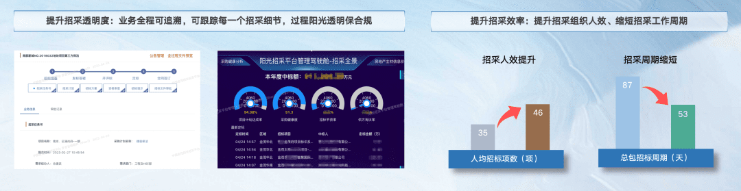 In terms of recruitment efficiency, the system supported the streamlining of recruitment organizations. The number of per capita bidding items increased from 35 to 46 per year. And the total contract bidding cycle was shortened from 87 days to 53 days. 数字化转型网www.szhzxw.cn