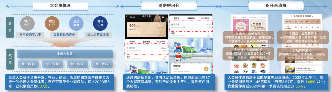 在消费得积分方面,通过购房返金珼、参与活动返金珼等87个金珼获取场景,有利于加快和提升客户消费。在积分再消费层面,各板块都有丰富的场景,比如停车优惠、贵宾活动、客房升级、京东卡兑换等等。积分再消费,提升客户互动粘性与频次,也助力了销售业绩增加。