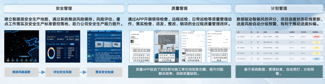 在安全管理方面,建立智建居安全生产地图,通过系统推进风险摸排、风险评估、重点工作落实及安全生产标准管控落地,助力公司安全生产能力提升。