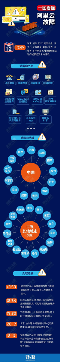 关于此次故障,截至记者发稿时来自阿里云的官方公告是,” 北京时间11月12日 17:44起,阿里云监控发现云产品控制台访问及API调用出现异常,阿里云工程师正在紧急介入排查。”根据更新的最新进展,截至12日21:11 ,受影响云产品均已恢复,因故障影响部分云产品的数据(如监控、账单等)可能存在延迟推送情况,不影响业务运行。 数字化转型网www.szhzxw.cn