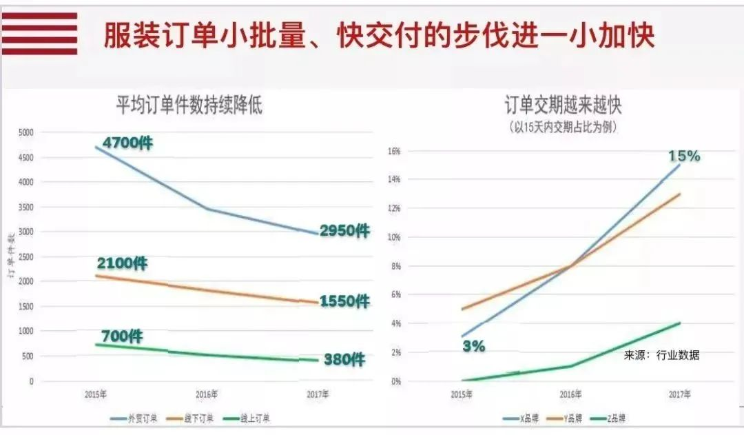 中国是全球最大的服装出口基地,过去一个外贸服装订单量可以达到百万级,后来订单量下降到了十万、五万级,今天服装的外贸订单最小批量只有3000件左右,线下订单达到1500件、线上达到380件。
