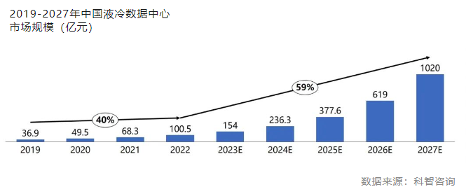 据《中国液冷数据中心市场深度研究报告》,中国液冷数据中心市场快速发展。过去几年保持40%的复合增长率。2022年,液冷应用爆发,市场规模达到100.5亿元。预计在人工智能等新技术普及应用带动下,至2027年,中国液冷数据中心市场规模将突破千亿大关。