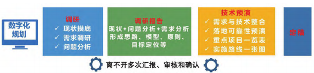 从实际出发,基于现状,开展多层次需求调研和考察工作,综合需求和考察结果,开展需求与技术整合工作,并开展部分技术方案预演。根据技术方案的预演结果和对比分析,整合分析结果,选取适合企业的数字化转型规划方案,并报企业数字化领导小组和外聘专家评审。数字化转型规划要做到分步实施、逐层递进、取长补短、整改不足、发挥优势,保证企业数字化转型规划工作圆满完成,具体过程如图2所示。