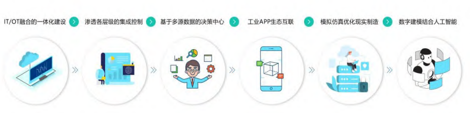 对玻璃纤维行业市场发展、智能转型、工艺特点的需求分析反映出行业在先进工业协同生产模式、智能化柔性生产、多变量产品工艺研发等方面的需求。由此我们提出可以采用工业互联网平台探索全新的生产运营模式,汇聚上下游产业的多源异构数据来满足玻璃纤维行业的发展需要。例如,整合风电、半导体等玻纤产业链的优势下游行业,建立以新产品、新标准为目标的工艺、原料及化工配方机理模型的联合研发,以智能互联提升玻璃纤维质量从而满足上下游产业需求。以下将玻纤行业工业互联网平台建设依次分为 6 个步骤进行介绍(图2)。