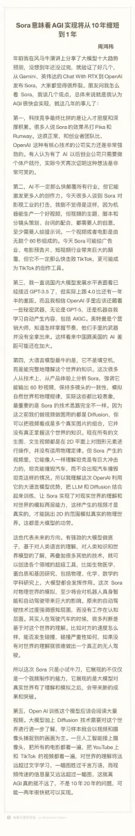 2月16日,360创始人周鸿祎发布微博提到自己对Sora的看法,周鸿祎认为,Sora的诞生意味着AGI(通用人工智能)实现可能从10年缩短至一两年。