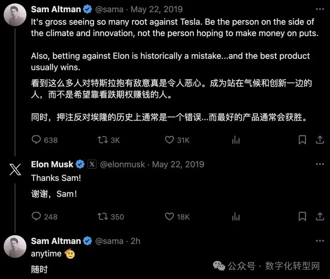 在这条对话中,他对当时正面临舆论压力的特斯拉表达了支持,而好兄弟马斯克对他表示了感谢。Altman po出一个敬礼的表情,表示只要兄弟需要,自己随时站出来支持。言下之意,似乎是在内涵马斯克落井下石的不义之举。 数字化转型网(www.szhzxw.cn)