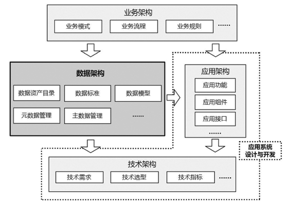 具体而言,数据架构基于业务架构,即业务模式、流程、规则等,来确定业务数据的需求。然后,通过统一的数据语言和操作手段,作为应用系统的应用架构(系统功能、组件、接口等)和技术架构(技术指标、技术选型等)的设计和开发依据。