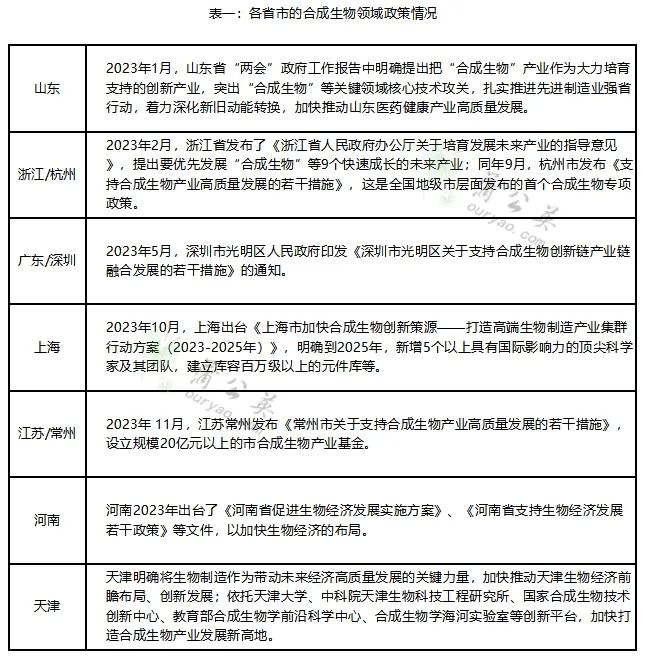 从各国的政策法规来看,2023年1月工业和信息化部等六部门印发《加快非粮生物基材料创新发展三年行动方案》,国家部委层面先后出台了8个与合成生物行业相关的政策法规,旨在推动、规范合成生物学技术的发展。省市层面,上海、浙江、广东(深圳)、山东、天津、河南等省市更是出台各种政策、优惠措施鼓励合成生物学企业的落户与发展,尤其是长三角和珠三角地区尤为前瞻和突进,各省市的政策详见表一。 数字化转型网(www.szhzxw.cn)