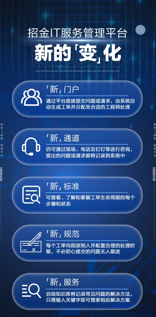 通过ITSM 落地,使招金矿业形成有效,有规范的交付网络和交付流程。从根本上解决“救火式”运维的现象,招金矿业“数字化IT运营服务体系”基于IT运营和服务最佳实践(ITIL)而设计部署,以用户为中心、以流程为导向的服务管理体系平台,致力于为企业用户提供“不间断的、最佳的服务”,进而有效推进招金矿业信息化的“流程化”、“标准化”、“规范化”、“智能化”建设与管理。