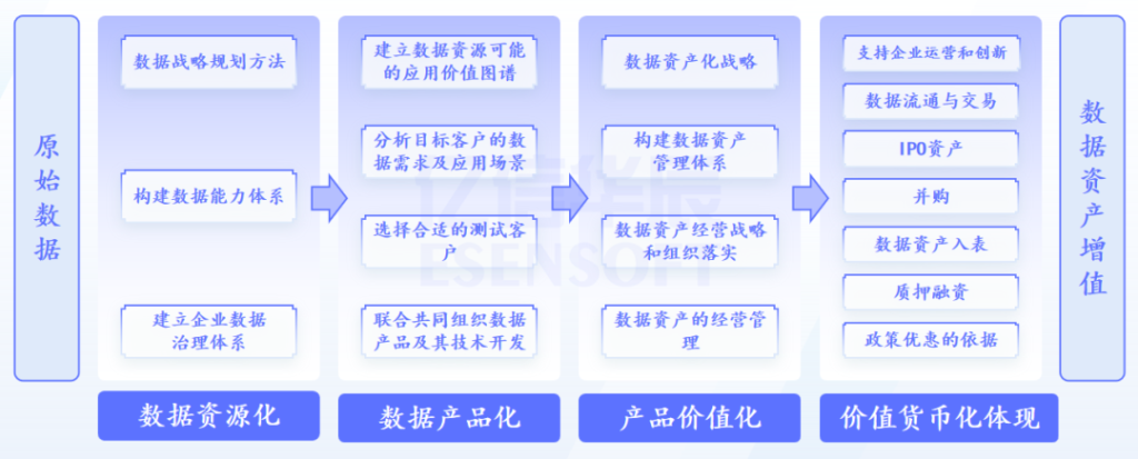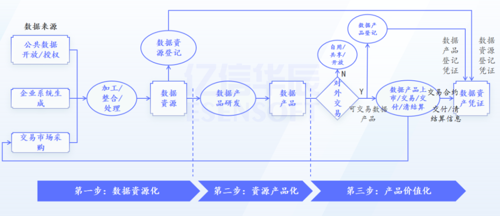 从技术上拆解数据要素价值的生成路径,企业数据要素与资产运营的建设路径可分为三个关键阶段:数据资源化、资源产品化和产品价值化。