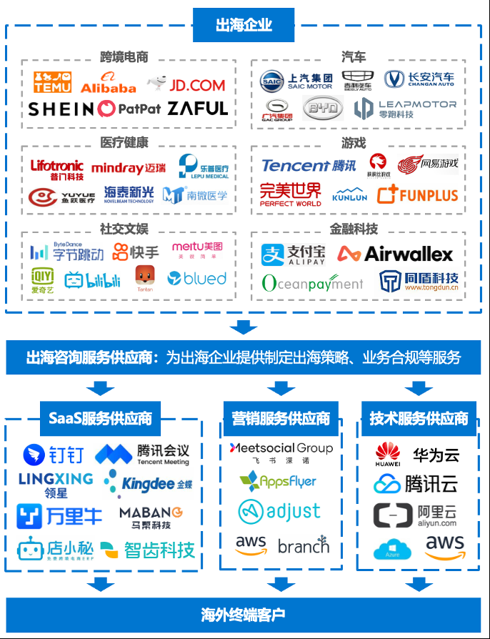 如今,中国企业出海已经形成了完善的产业生态,参与者不仅包括出海企业,还包括为出海企业提供数字化服务的供应商,如技术供应商、营销服务供应商及SaaS服务供应商等。