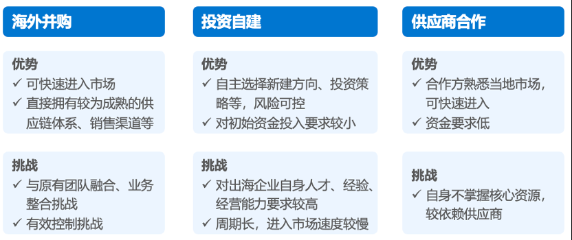According to the characteristics of different overseas markets and industries, Chinese enterprises’ going abroad mainly includes three ways: overseas mergers and acquisitions, investment and self-construction and supplier cooperation. Overseas M&A refers to the acquisition of existing overseas companies or teams to acquire their technology, business, brand and other resources to quickly enter overseas markets; Investment and self-establishment refers to the establishment of new companies directly overseas, starting from 0 to expand the market; Supplier cooperation refers to the cooperation with mature sales suppliers, who help enterprises to expand overseas markets.