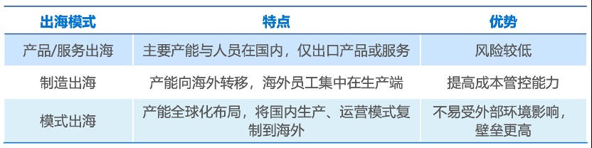 历经40余年发展,中国企业出海模式持续迭代,目前主要包括产品/服务出海、制造出海、和模式出海三类。