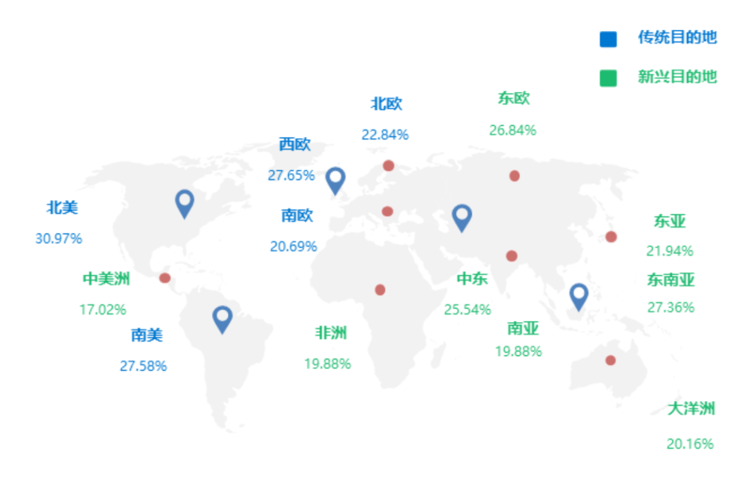 Intelligent research data show that North America, Western Europe, South America, as a traditional destination, is the most selected by enterprises to go to sea, 30.97%, 27.65%, 27.58% of the enterprises in the region layout, but has gradually been Southeast Asia, the Middle East and other emerging regions to catch up, more and more enterprises began to choose the emerging region as a destination.
