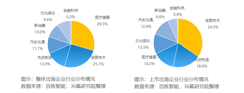 从行业分布上看,信息技术、先进制造、医疗健康三大行业的企业出海积极性最高。其中,医疗健康行业以29.45%的占比位居出海企业数量榜首。上市企业中,信息技术和先进制造海外布局能力更强,两者占比超过50%。 数字化转型网(www.szhzxw.cn)