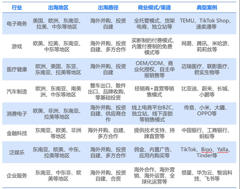 全球化浪潮下,越来越多中国企业开始拓展海外市场,出海行业、目的地、路径及商业模式愈加丰富。以电子商务行业为例,主要出海目的地为购买力强的欧美地区和有较大上涨空间的东南亚、拉美、中东地区,出海路径包括如阿里收购Lazada的海外并购模式和如拼多多推出电商平台Temu的自建模式。