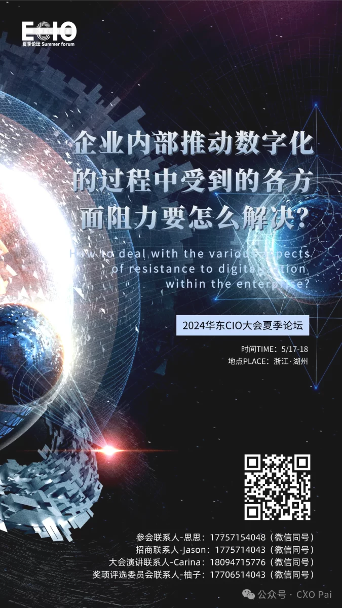 2024华东CIO大会夏季论坛将于5月17-18日隆重召开。企业内部推动数字化的过程中受到的各方面阻力要怎么解决?期待在这场思想盛宴上您能够得到更多的解答!