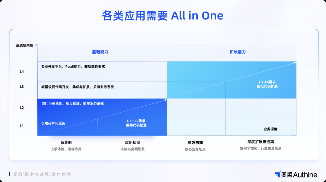 这便是奥哲的“业务数字原生 2.0”,以及将低代码和零代码进行有效融合的“All in One”理念提出的大背景。