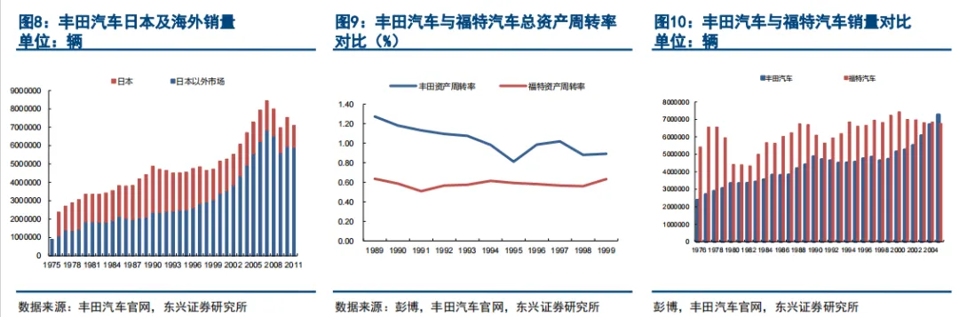 Toyota’s achievements: Lean manufacturing finally achieved remarkable results in efficiency improvement, according to the “Machine that changed the World”, Toyota’s lean manufacturing plant in the final assembly link efficiency is significantly ahead of the same period of General Motors, and the product defect rate is much lower than General Motors. Toyota Motor not only gained a large market share in the domestic market, but also surpassed Ford in global vehicle sales in 2005. According to Toyota’s official website, Toyota’s domestic market share in Japan has steadily increased from 37% in 1960 to more than 40% in the 1970s and reached 48% in 2010. Toyota has demonstrated its strong competitiveness in overseas markets, with overseas sales increasing from 900,000 in 1975 to 6.84 million in 2007. Due to the lack of earlier data, only in the 1990s, Toyota Motor showed higher asset turnover efficiency, especially in the first five years of 1990, Toyota’s total asset turnover rate was significantly faster than Ford.