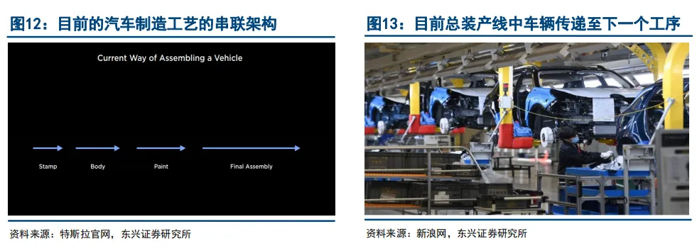 特斯拉 unbox 生产工艺:2023 年 3 月,特斯拉召开投资者日,展示了他们的新生产模式 unbox。行业目前 的总装车间是由焊接形成白车身(box)经过涂装喷漆后开始,总装线采用串行模式在狭小的车身空间(box) 中完成。当前的总装线上,存在几个主要的待改善点:冗长的串联模式,上一个工序未完成,下一个工序就无法开启。一个环节出问题将导致流程阻塞。车身空间(box)狭小,大幅制约安装效率,总装环节自动化率低于其他几个环节。白车身在通往下一个工序的运输过程中存在着工时浪费。一些重复工序的浪费,如焊接工序结束,需要将车门安装到车身上,进入涂装环节。涂装结束,进入总 装需要将车门拆卸下来,以方便工人进出安装内饰件,然后再装上车门。