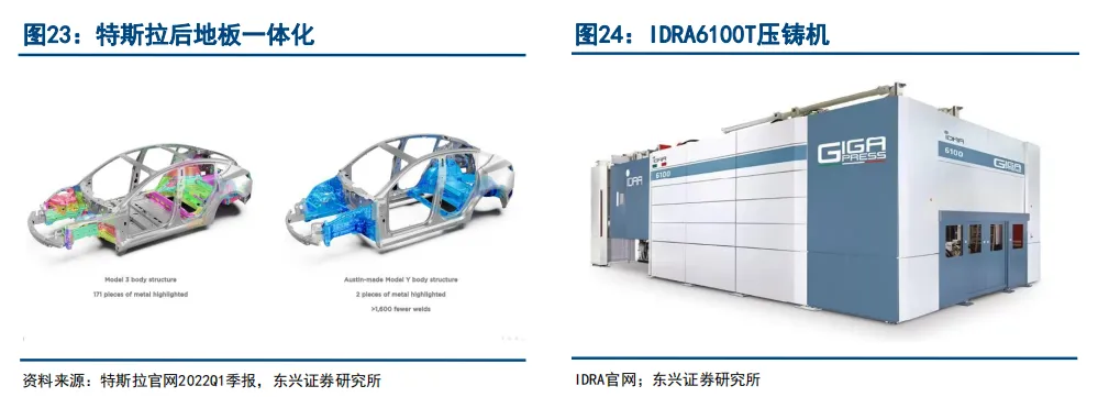 目前一体化压铸在车身上运用主要是后地板和前机舱。一体化压铸工艺的实现得益于大型压铸设备及铝合金 材料端的进步。大吨位压铸机的不断进步:我们通过压铸机设备商 IDRA 推出产品的节奏就能看出这一趋势,1966 年 IDRA 推出第一台 2000T 的设备、1973 年推出 3200T 的设备、1993 年推出 4000T 的设备。在 2020 年, IDRA 收到了世界上第一份 6200 吨和 8000 吨压铸机的订单,同时 IDRA 也是第一获得 9000T 压铸机订 单的企业。9000T 压铸机用于制造 SUV 和皮卡等产品的大型压铸件。合金材料及模具等配套产业的不断成熟都促使了一体化压铸工艺的进步。