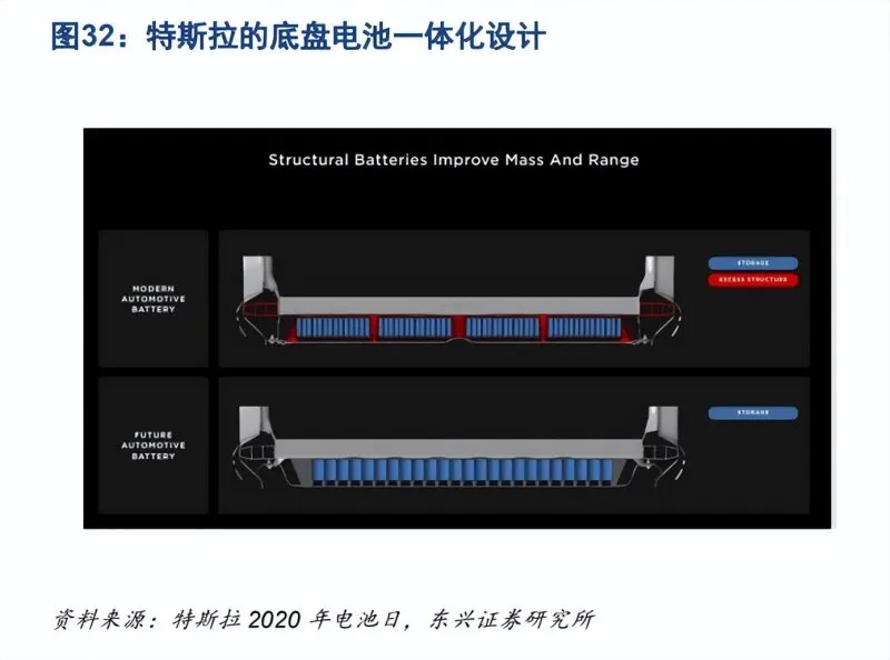 电池包与汽车底盘的融合设计成为行业的趋势,2020 年特斯拉电池日发布了其电池包底盘的设计方案,该方 案将有效减少 370 个零部件,也将使得底盘(融合了电池包)的工厂投入每 GWH 下降 55%,工厂 空间下降 35%。电池底盘一体化设计也有利于 unbox 方式中底盘的独立安装。