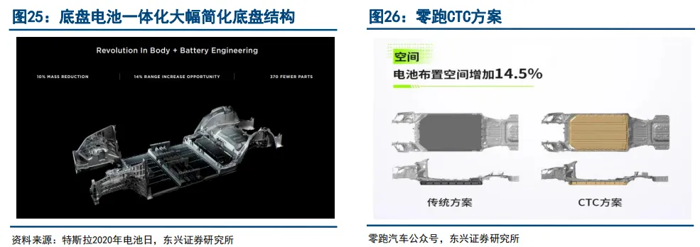 电池底盘一体化方案也得到其他车企的应用。如 2022 年 4 月零跑发布 CTC(cell to chassis)技术,将电池与 底盘集成化设计。2022 年 5 月比亚迪发布 CTB(cell to body)技术并首次搭载到海豹车型上,电池包上盖 与车身底板集成设计。2023 年 6 月发布的小鹏 G6 采用了 CIB 技术,也同样为电池和底盘的融合设计。