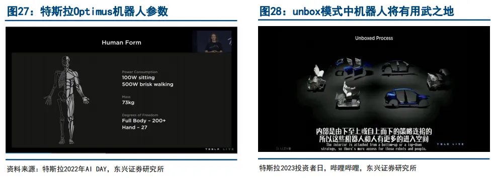 Advances in technologies such as AI will also facilitate the arrival of new production models. Tesla’s latest Optimus humanoid robot, unveiled at AI Day 2022, features 100W sitting power, 500W fast walking power, 200 + joint degrees of freedom, and 27 degrees of hand freedom. According to Tesla’s 2023 Investment Day, the Unbox solution realizes an open assembly space, which will be more convenient for robots and humans to operate. We believe that there is a lot of mechanical work in the automotive assembly process (such as screwing), and with the opening of the assembly space, it will be conducive to the improvement of the automation rate. The assembly of Unbox may become a good application scenario for humanoid robots.