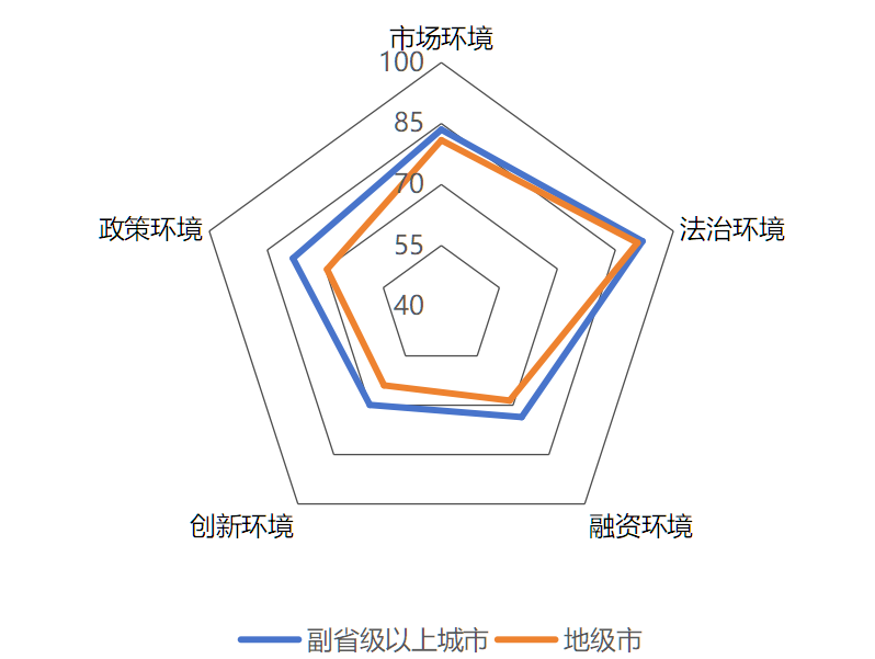 从中小企业发展环境各维度得分情况来看,在法治环境、市场环境两方面,副省级以上城市和地级市的表现比较接近,在政策环境、创新环境和融资环境三方面,副省级以上城市的表现则明显优于地级市。