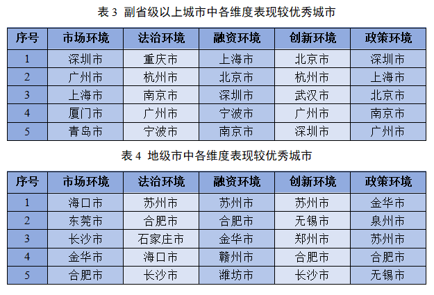 市场环境方面,深圳、广州、上海、厦门、青岛得分居副省级以上城市前5位,海口、东莞、长沙、金华、合肥得分居地级市前5位。