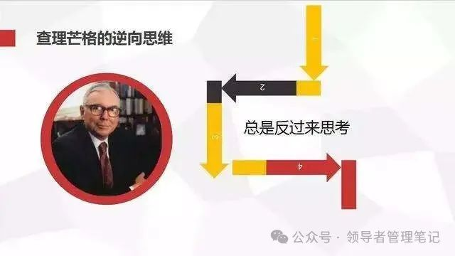 查理·芒格提倡的逆向思维(Inversion thinking)是一种反传统、反常规的思考方式,它强调从问题的反面或对立面出发,通过识别和避免错误、风险以及不利因素,来找到解决问题的新方法。