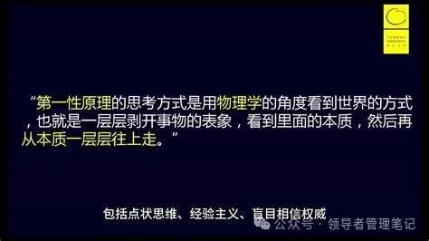 马斯克提倡的第一性原理(First Principles)强调从最基本的原理出发,逐步推理,得出结论。古希腊哲学家亚里士多德的思想,主张透过现象看本质。这种思维方式有助于我们更深入地理解问题的本质,并找到更有效的解决方案。 数字化转型网(www.szhzxw.cn)