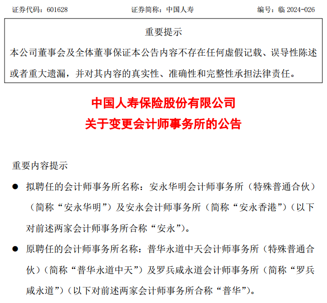6月11日晚间,中国人寿公告,公司拟聘任安永华明会计师事务所(特殊普通合伙)担任2024年度境内审计师,同时聘任安永会计师事务所担任2024年度香港审计师。