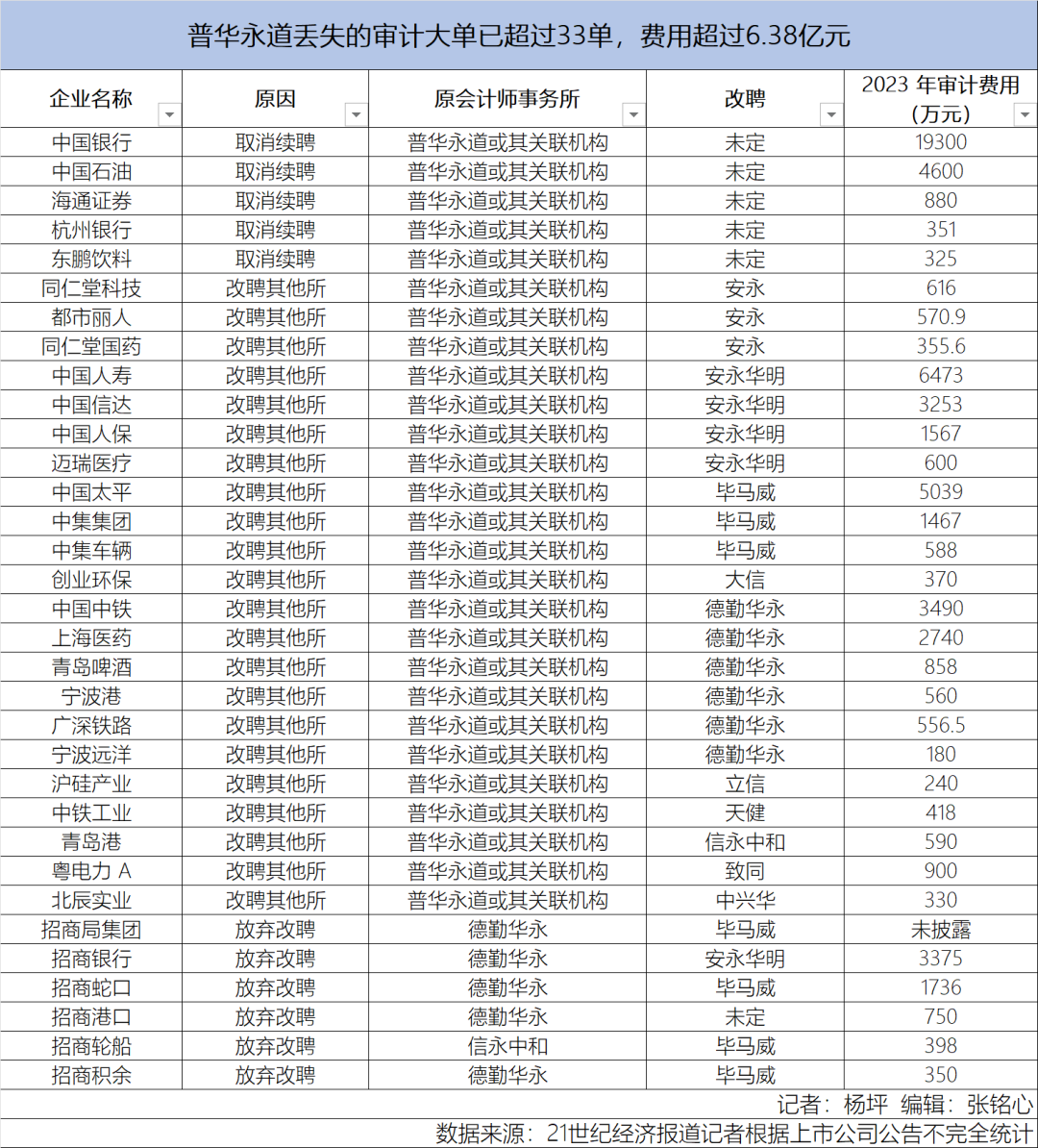 据21世纪经济报道记者不完全统计,截至6月12日,普华永道在境内公开丢失的审计大单已经超过33单,其中,22家企业弃聘普华永道改聘其他会计所、5家企业取消续聘普华永道、6家招商系公司放弃改聘普华永道。剔除未公布审计费用的招商局集团,剩余32家企业2023年审计费用合计超过6.38亿元。