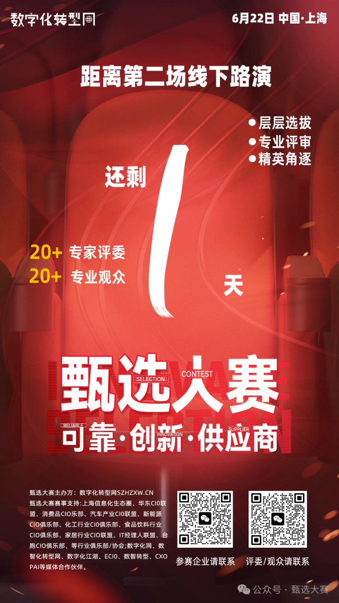 上海 2024年6月21日 数字化转型网记者报 —— 在数字化转型的浪潮中,寻找可靠的合作伙伴比以往任何时候都更为重要。第二届甄选大赛第二期路演活动将于2024年6月22日在上海隆重举行,旨在为参与企业用户精选出一批值得信赖、创新力强、质量上乘的供应商。