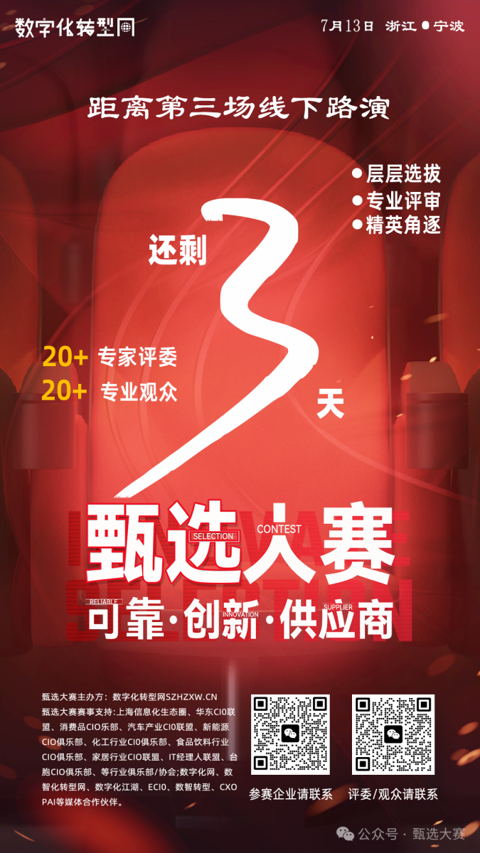 宁波,2024年7月9日,数字化转型网 —— 随着全球经济的快速发展和创新技术的不断涌现,企业对于合作伙伴的选择愈发注重其可靠性、创新性和优质性。为了响应这一市场需求,甄选大赛第三期路演将于2024年7月13日在宁波隆重举行。旨在为参与企业搭建一个高效、专业的平台,精选出一批值得信赖、创新力强、质量上乘的供应商。