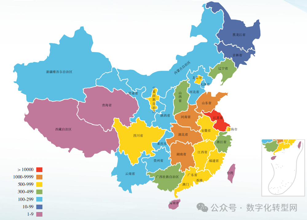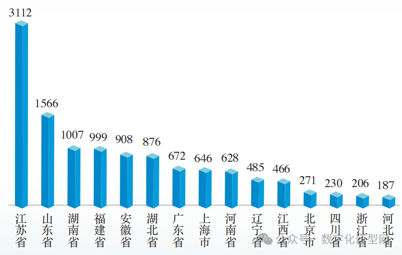 全国各省积极开展智能制造对标诊断工作。其中江苏省继续保持全国领先,省内达到智能制造能力成熟度二级及以上企业数量累计达到 3112家。另外山东、湖南、福建、安徽、湖北、广东、上海、河南等省位居全国前列,达到智能制造能力成熟度二级及以上的企业数量,均超过 500家。