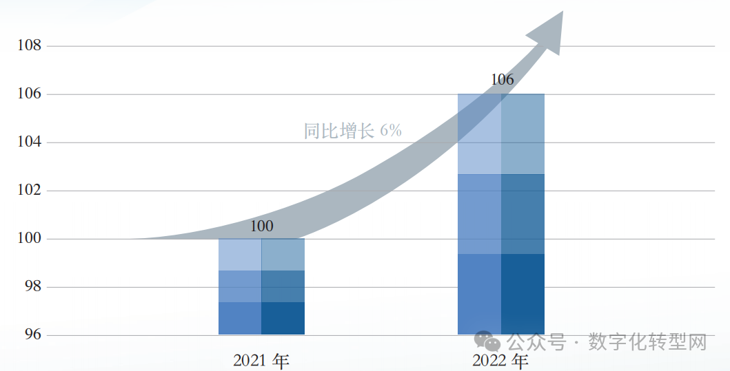 整体来看,全国智能制造成熟度水平稳步提升,2022年我国的智能制造成熟度指数同比增长6%,为106。