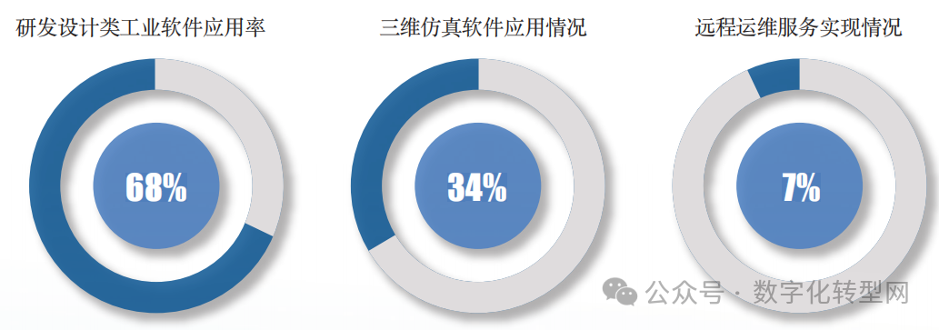装备制造领域各类工业软件应用最为广泛。应用了研发设计类软件开展产品设计和工艺设计的企业占比68%;使用了三维仿真软件的企业占比34% ;为产品提供远程监测、故障预警、预测性维护等服务的企业占比7% 。 数字化转型网(www.szhzxw.cn)