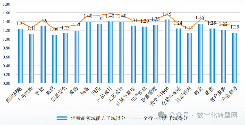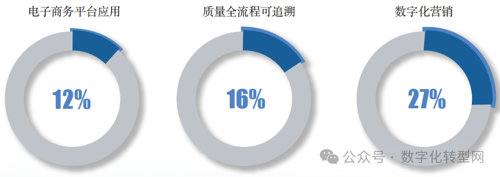 根据统计,消费品工业中电子商务平台应用率达到12%。质量全流程可追溯率为 16%,采用了数字化营销手段的企业为27% 。
