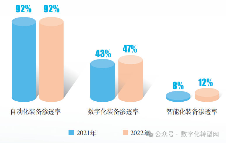 根据统计,我国装备数字化智能化水平中,有92%自动化装备渗透率,有47%数字化装备渗透率, 有12%智能化装备渗透率。