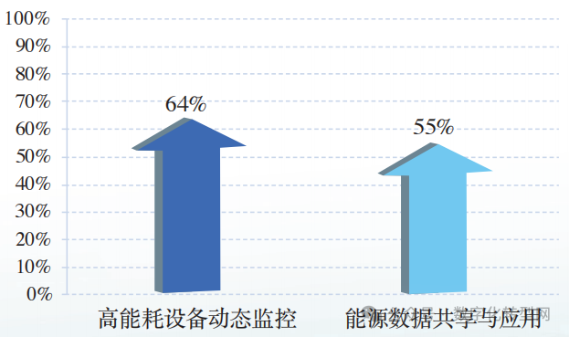 在达到智能制造能力成熟度二级的企业中,实现了重点高能耗设备的动态运行监控和设备能效评估的占比为64% ,实现了能耗数据与生产、工艺数据共享的占比为55% 。