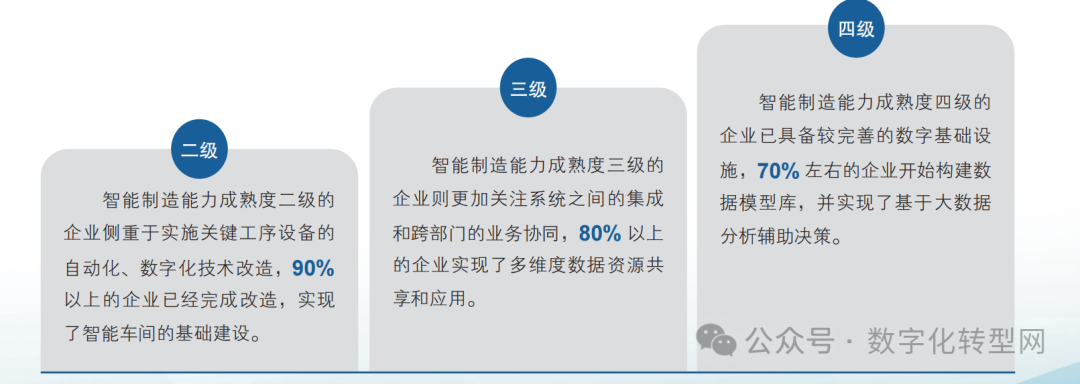 二级:智能制造能力成熟度二级的企业侧重于实施关键工序设备的自动化、数字化技术改造,90%以上的企业已经完成改造,实现了智能车间的基础建设。