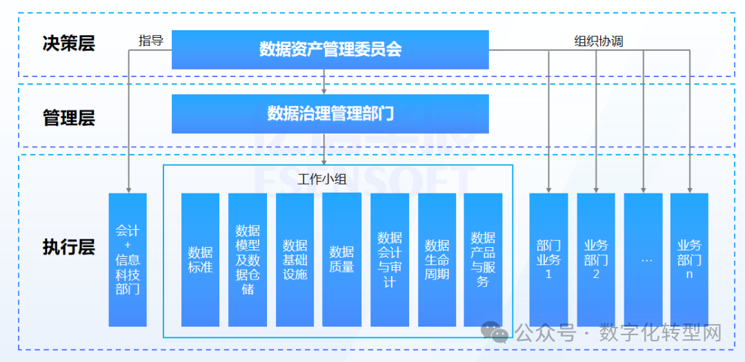 在具体的落地过程中,建立全方位、跨部门、跨层级的数据资产管理组织架构,是实施组织级统一化、专业化数据资产管理的基础,是数据资产入表工作责任落实的保障。