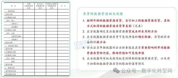 存货的数据资源相关披露需要按照外购的数据资产存货、自行加工的数据资源存货和其他方式取得的数据资源存货等类别进行披露,需要披露数据资源存货成本所采用的方法、计量方法、以及确定依据、计提方法、影响因素。
