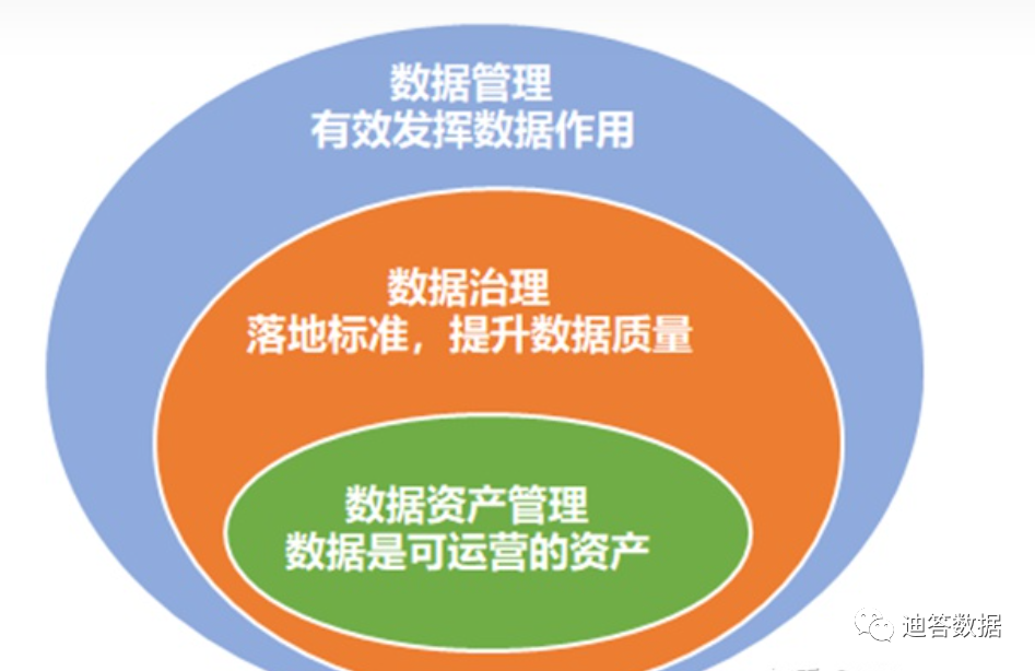 Data management includes data governance, and the concept that governance is part of overall data management has been widely recognized by the industry. Data management encompasses a number of different areas, one of the most prominent being data governance. Data assets are based on data governance, and the core is how to realize data value, reflect data value, and complete data empowerment. The relationship among data management, data governance and data asset management is shown in the figure.