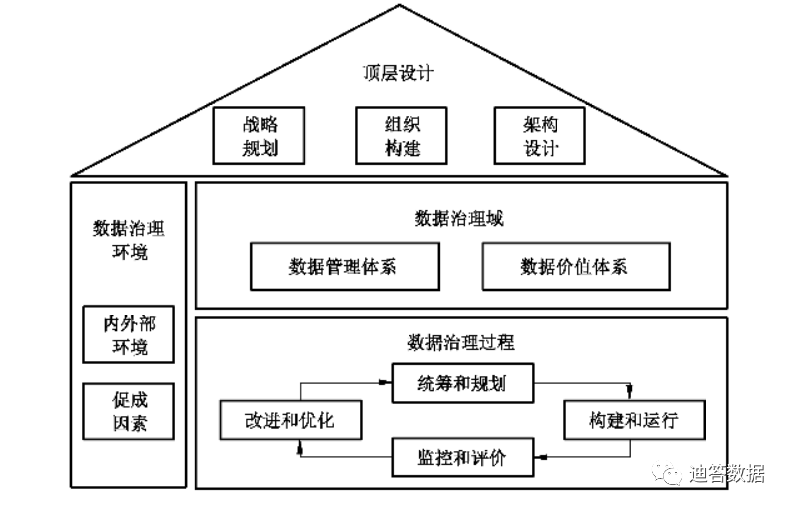Top-level design includes data-related strategic planning, organization building, and architecture design, and is the foundation of data governance implementation. Data governance environment includes internal and external environment and contributing factors, which is the guarantee of data governance implementation. Data governance domain includes data management system and data value system, and is the object of data governance implementation. The data governance process, which includes planning and planning, building and running, monitoring and evaluation, and improvement and optimization, is the method of data governance implementation.